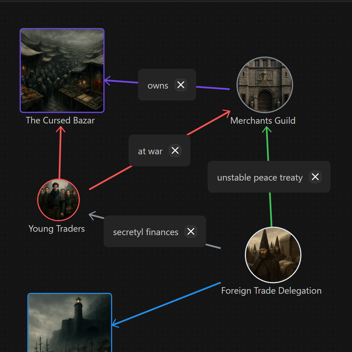 Map characters, locations, factions, and plots as a living graph. Quick and intuitive, as fast as you can imagine them.